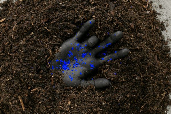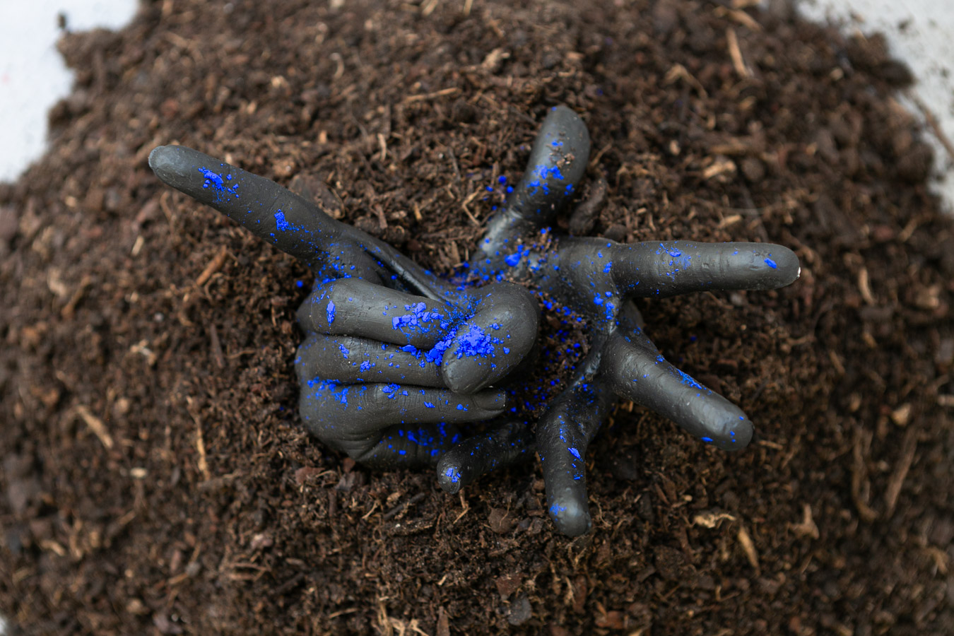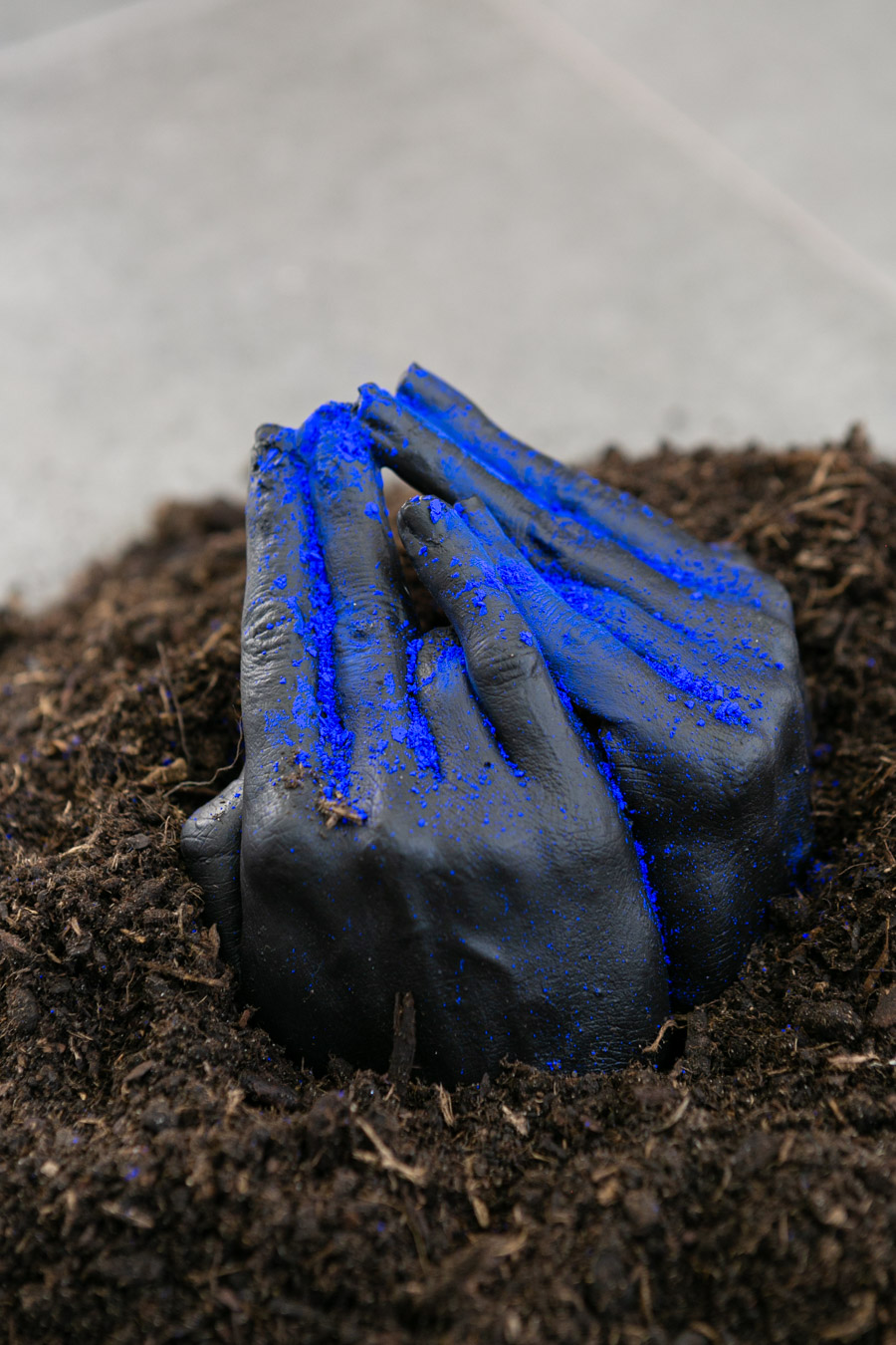 These mudras grow upwards, from the ground, denoting their entrance into the world from the space of an alternate territory or the Sita (as featured in Sita means furrow). They are painted black, a nod to Durga’s most famous avatar – Kali, the goddess of darkness, destruction, death and rebirth. They are incarnations of alterity emerging from the void. Their anointment in the famously unstable Ultramarine pigment testifies to their volatile and mutative nature.